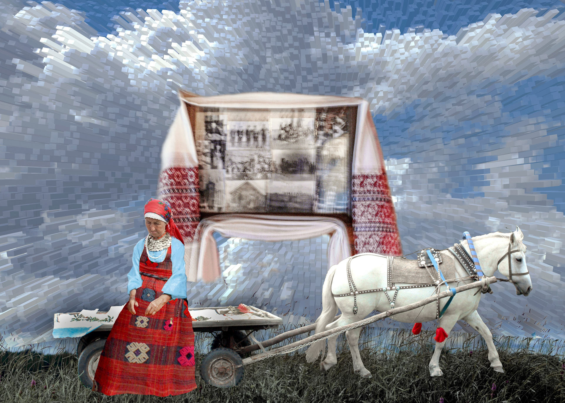 Используя технику цифрового коллажа, я создаю пространство, где архивные образы переплетаются с символами культурного кода. Коллаж здесь выступает метафорой того, как работает наша память: со временем она неизбежно становится фрагментарной, сохраняя лишь самые яркие осколки — обрывки фольклора и детали орнаментов.